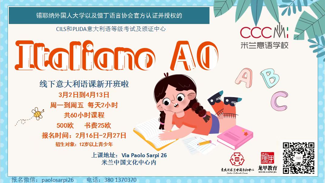 ) s+ f- w7 s' s9 W6 u* b5 s6 H📌 核心语法入门 课程时间:3月2日-4月13日 周一至周五 每天2小时 微信报名:cccmiscuola 电话报名:3801370370 |