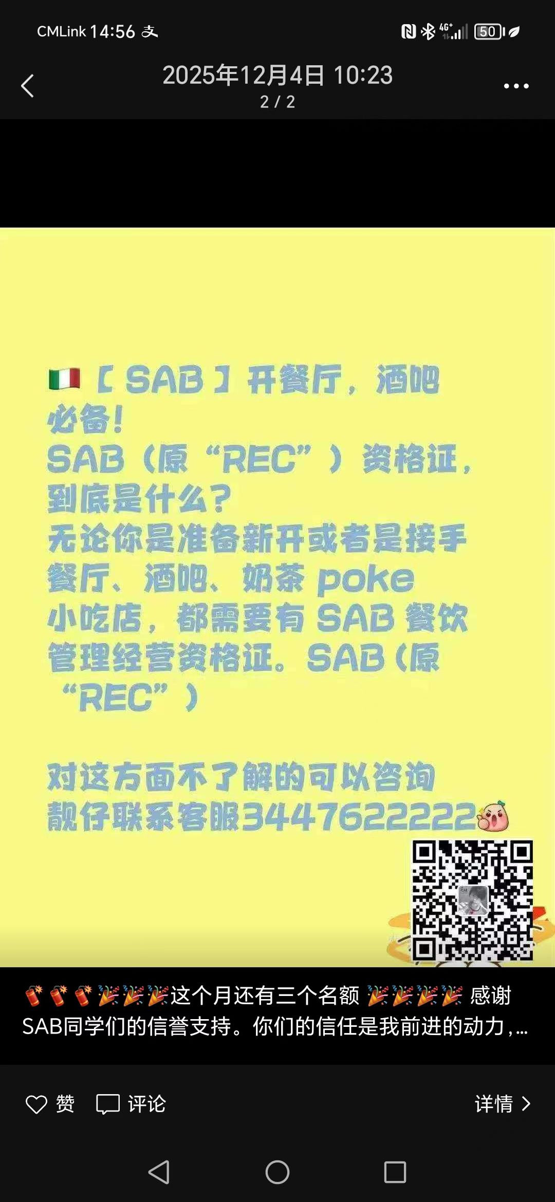 家人们!今天咱来唠唠意大利餐饮界一个超重要的“神秘武器”——SAB(原“REC”)资格证,这简直就是开餐厅、酒吧等各类美食小店的必备“通关秘籍”啊!想象一下,你满心欢喜地准备开一家超酷炫的餐厅,或者打算接手一家热闹的酒吧,又或者想开一家温馨的奶茶店、时尚的poke小吃店,那感觉就像即将踏上一段充满美食诱惑的冒险之旅。可要是没有SAB资格证,那就好比你要去航海却没有指南针,在美食的海洋里很容易就迷失方向啦!这SAB资格证到底是个啥玩意儿呢?它就像是一位隐藏在餐饮江湖背后的超级大侠,虽然平时不显山露水,但却是餐饮行业合法经营的“护身符”。有了它,你的店就能在餐饮的江湖里稳稳当当立足,就像给店铺穿上了一层坚固的铠甲,能抵御各种潜在的风险。它可不是一张简单的纸,而是代表着你在餐饮管理经营方面的专业能力和合规性。就像一场精彩的武林大会,只有拥有这张“入场券”,你才能在这场餐饮的盛宴中大展身手。有了SAB资格证,你就像是拥有了一把开启餐饮成功大门的钥匙,能让你的店铺在众多竞争对手中脱颖而出,成为食客们心中的“美食圣地”。所以啊,各位怀揣着餐饮梦想的小伙伴们,可千万别小瞧了这个SAB资格证,它可是你实现餐饮梦想道路上的重要“法宝”哦!赶紧去把它拿下,开启你的餐饮传奇之旅吧!